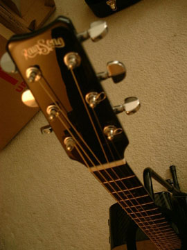 First off, the headstock is blurry. The "RainSong" inlay is very blurry, as are the top two tuners. But you'll also notice that the bottom tuners are slightly more in focus, and the guitar stand, cardboard box and carpet are even more sharply focused. The problem, then, is that the headstock is blurry because the camera has focused somewhere near the floor.Solution: Make sure you're focused on the right part of the photo. If you're using a point and shoot camera, make sure you focus on the headstock by centering the headstock in the viewfinder and depressing the shutter release down half-way. On most cameras this will lock the focus and allow you to re-compose the picture as long as you keep the shutter release depressed. All cameras operate slightly differently, so reading the instructions that came with your camera is important if you want consistent, predictable results.