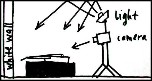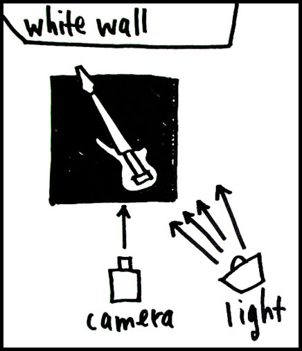 Another thing that helps make this bass look nice are the soft shadows. If i had a "real" photo studio, I'd have access to a lot of lighting equipment which would be useful for easily producing soft shadows (umbrellas, soft boxes, etc.). But since I don't have any of that kind of equipment available, you can get similar results by aiming the light source upwards at the ceiling. As you can see in the second diagram, the light bounces off the ceiling and then down onto the bass. By doing this, the ceiling itself acts like a large light source and therefore produces much softer shadows. Just directing a bare bulb directly onto the bass would have yielded a much harsher lighting effect (remember page two?).