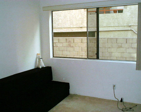 This is my apartment (note the fabulous Los Angeles view outside my window). The black thing in the foreground is a fold-out foam futon that I sleep on. Instead of a sheet, I use that as my "backdrop". Not that I wouldn't benefit from having access to a nice studio - that would definately make everything faster and easier. But what you already have is probably good enough, and it's free.
