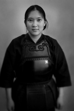 This is a picture of Nancy wearing kendo armor (kendo is a traditional Japanese martial art). Not having access to a 'real' photo studio, I just asked her to stand in front of a empty wall near the kitchen, with an open window acting as the light source. I used Photoshop to convert the image to black and white, "remove" the floor (rubber stamp tool), blur some areas (more blurring near the bottom to simulate large format photography), darken others with the burning tool, and crop the image. The idea was to create something similar to an old-fashioned, formal-looking portrait.