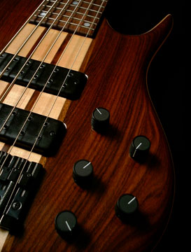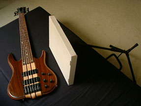Seven: Make Use of "Good Reflections"Reflected light isn't always bad for your photos. Sometimes "controlling reflections" may not mean eliminating them, but rather creating them. In addition to lighting the subject with direct light, you can also use reflected light. You create reflected light by "bouncing it" to a part of the bass that is "in a shadow" and therefore hard to see. This can be easily done by using a reflector card, and doing this can really make a photograph look nicer, especially if you have only one light source. A reflector card can be made by simply glueing a sheet of white paper onto a piece of cardboard. The white surface of the paper may not be suitable for "large subjets" like automobile photography or Sports Illustrated-type swimsuit photography, but it'll do just fine for photographing small things like bass guitars. In a pinch I've even used things like aluminum pot-lids or baking pans as reflectors - these work well too.