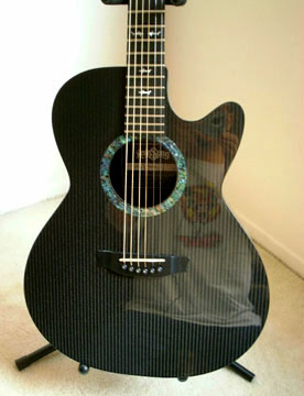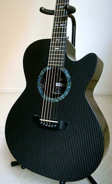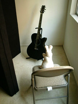 See how the guitar is now "reflecting nothing" towards the bunny (me)? From this angle, then, you get the black graphite weave of the guitar's top, instead of a clear view of my desk, computer, and bookshelf on the other side of the room.