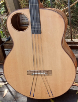 The Tinozza acoustic bass guitar is similar to most ABGs in size, construction and materials. The scale length is 34" and the neck meets the body at the 14th fret. Neck dimensions and string spacing follow the standards set by Fender electric basses. The fingerboard radius is 7.25". The body is 18" wide at the lower bout. When it comes to bass tone bigger is always better for an ABG but bigger bodies make it increasingly more difficult for the player to get his or her arm around the body. Wood suitable for two piece plates is also not that easy to find for instruments much wider than this. At 6" the body is deeper than most ABGs. This means it encloses more volume and thus lowers the lowest resonance of the instrument somewhat closer to the ideal for bass instruments. One can't get too carried away with body depth for the same reasons of ergonomics that limit the width of the body – too deep and the player has trouble reaching around the instrument to play it.