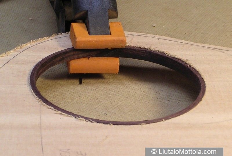 Instructions for binding the sound hole of the flattop acoustic guitar. Soundhole binding is a decorative technique that is not often used, but it is a nice touch for an instrument with an offset soundhole or any instrument where a more traditional rosette is not appropriate. The instructions are for binding the hole with wood, a somewhat tricky operation that will test the luthier's wood bending skills. The loop of binding is joined with a horizontal scarf joint.