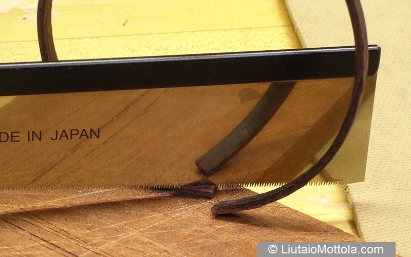 Remove the strip from the mold and trim one end at approximately a 45° angle, using the razor saw. If the binding strip has any runout, make the cut in the direction of the runout. This will make it easier to plane the strip down to the surface of the top later.