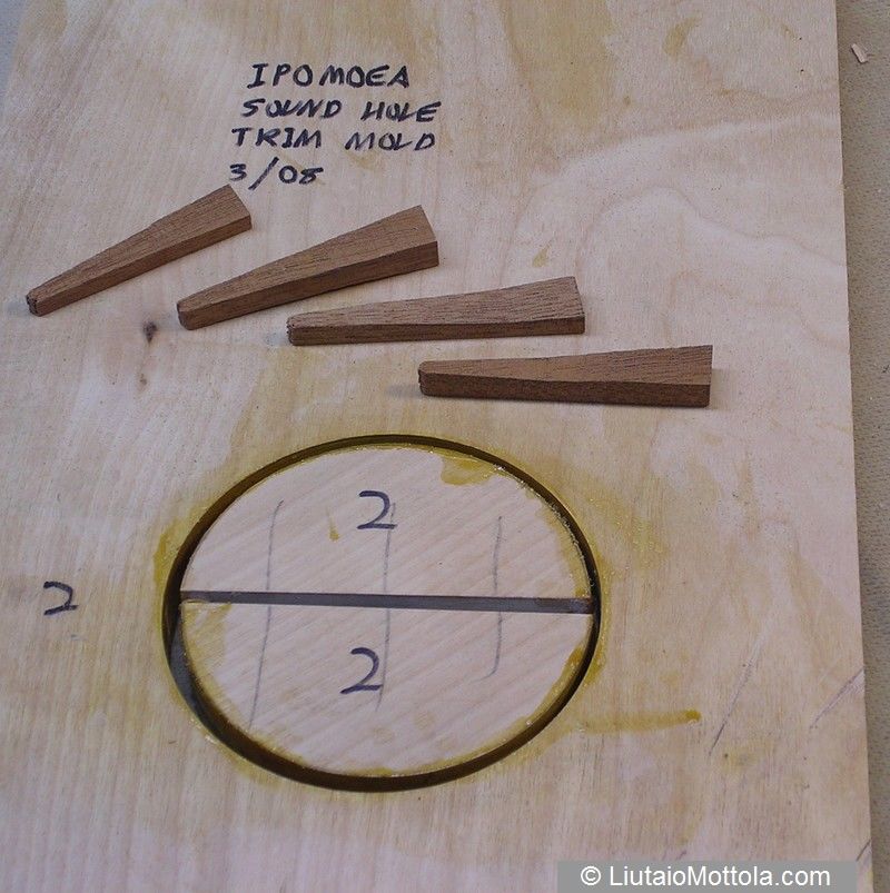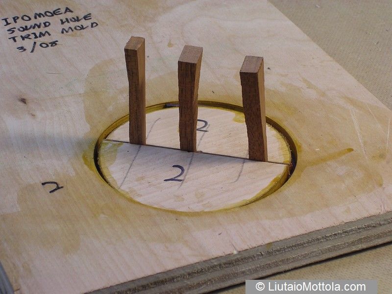While your drill press (or router or hole cutter) is set up for the size of the soundhole, you can make a simple mold for the binding out of a scrap of plywood. The mold consists of a hole of the same diameter as the soundhole cut through the plywood, and a plug made of the same material. Since the binding material is 0.1" thick, the radius of the plug is 0.1" less than that of the hole. Then a 0.25" strip is sliced out of the middle of the plug so you now have two half circle pieces that you can tighten up by pushing wedges between them. Here's the mold:
