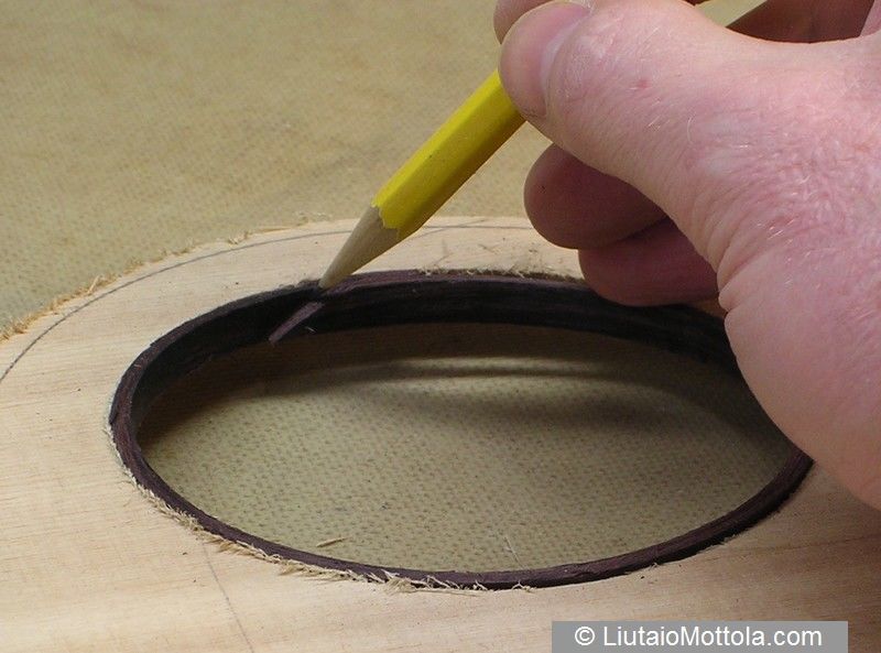 Now push the strip into the soundhole so that the cut end lays over the uncut end. Press the strip as best you can to the walls of the hole and then mark the uncut end to the surface of the cut end like this: