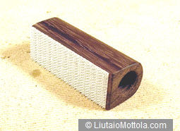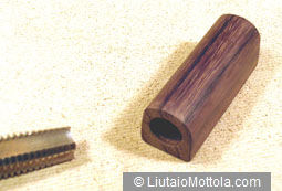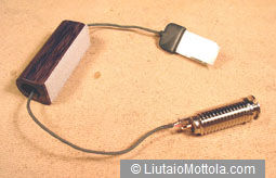 The first step is to build the jack holder. Start with a piece of ebony or rosewood 0.75'' square by 2.25'' long. Drill a blind 0.5'' hole 2'' deep, centered in one end of the wood. This is the hole for a threaded end pin jack. The hole does not go all the way through the piece. Next drill a 0.125'' hole right through the piece so the wire can extend out the back. The 0.5'' hole is then threaded using a 9/16" – 12 tap. The first photo shows the completed jack holder. Two of the edges of the holder have been rounded over for appearance. Sand and polish this piece as you see fit.