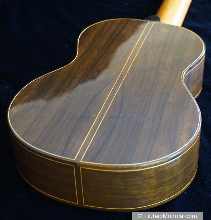 The instrument features a one piece European spruce top which is fan braced. The neck is mahogany. Back, sides, bindings, head plate and fretboard are Brazilian rosewood. Nut and bridge saddle are bone. The instrument is finished with French polish, the top antiqued using pigmented shellacs.