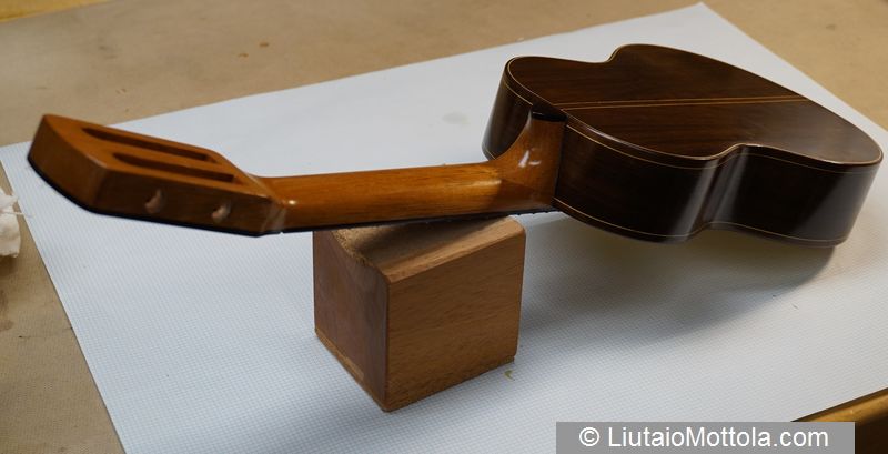 Construction of this instrument is conventional in every way with the exception of the Panormo style bridge and the slotted headstock. As noted, cut down classical guitar tuning machines are used on this instrument.