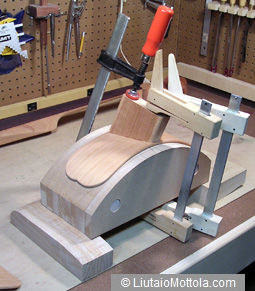 Most Electric Upright Basses (EUB) are mounted to a tripod or they have an end pin and are played balanced upon it in the same matter as an upright bass is played. The Libellula EUB is different in that it is worn on a strap, much as one would wear an electric bass. The body of the instrument is held away from the player's body by a curved wood wing which is attached to the back of the bass. This wing contacts the player's abdomen and makes playing the instrument quite comfortable. This page shows how the wing of the instrument is built.