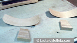 After the wing blank is laminated it is cut out and shaped and sanded. The wing attachment block is cut out next. Here are two wings with their attachment blocks.