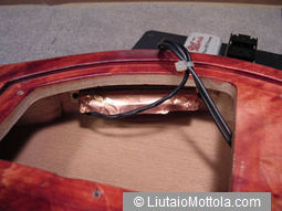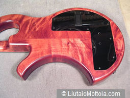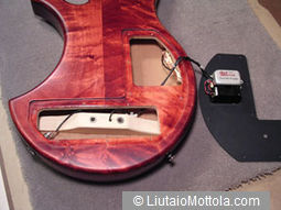 The Gotoh battery box is mounted in the cover and the preamp in its shielded box is also mounted to the cover. Note the two holes in the cover plate that provide access to the bridge height adjustment screws. Note also the strap button mounted up a little from the centerline. This helps the instrument hang from the strap at a better angle.