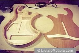 This picture shows the braces glued to the top, but the bridge brace is not yet drilled for the threaded inserts for the saddle height adjusting screws. It also shows the string anchor plate glued into the body. In the plan, at the butt end of the body there are two bosses that have not been routed away when the body was hollowed. These get cut down 0.25" and a 0.25" hard maple string anchor plate is glued onto them. When the top is glued on, its bottom surface will contact the top surface of this plate. After the top is glued on the mortise for the neck joint is routed into the top. The instrument has a set neck, using a Gibson electric style horizontal dovetail joint.
