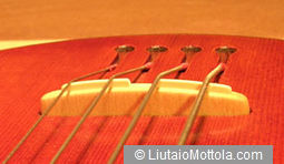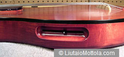 The keyhole string anchor holes are routed right through the top and the string anchor plate. Here you can see both the bridge height adjustment screws and threaded inserts in the brace and, behind the brace the string anchor plate in the finished instrument.