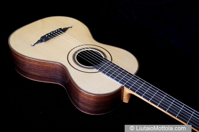 The body of the guitar is made of rosewood as are the bindings. The back is in two pieces with a simple maple back strip between the two. There is a wedge shaped end graft on this replica. Panormo used either straight or wedge shaped end grafts.