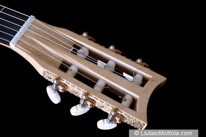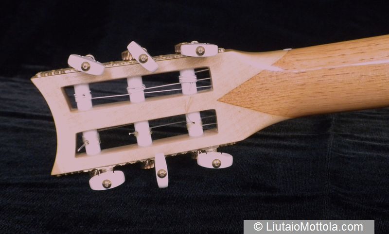 The headstock of this replica is made of a solid block of maple. The top of the headstock of Panormo's instruments had a recognizable half moon shape. The walls of the slots in the headstock are quite thin and the slots themselves are tapered, narrower on the bottom end than on the top. The instrument pictured has modern tuning machines built in the style of the machines that originally graced these instruments and were built by Rance and then Baker.