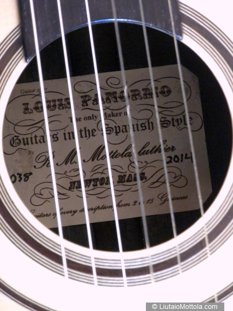 The guitar pictured features a one piece top, typical of Panormo's guitars of this period. The narrow grain is on the treble side. The soundhole is decorated with a rosette made of rings of wood veneer, in a fashion currently associated with steel string guitars. Internal bracing is typical of Spanish style guitars today. The backs originally had two transverse braces, but by the period of this replica had three. The tops had upper and lower transverse braces and fan bracing on the lower part.