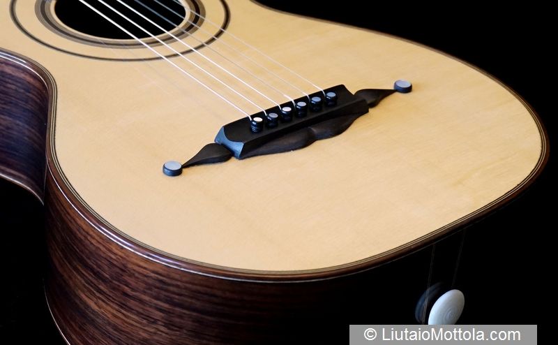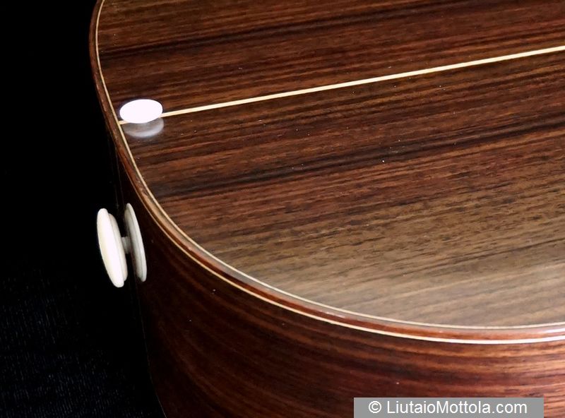 Panormo's instruments featured large end pin buttons and also two small buttons on the back. These are all made of bone. The large end pin button screws on and off and is used to anchor a strap. The back buttons were used to tie the guitar to the player's clothing.