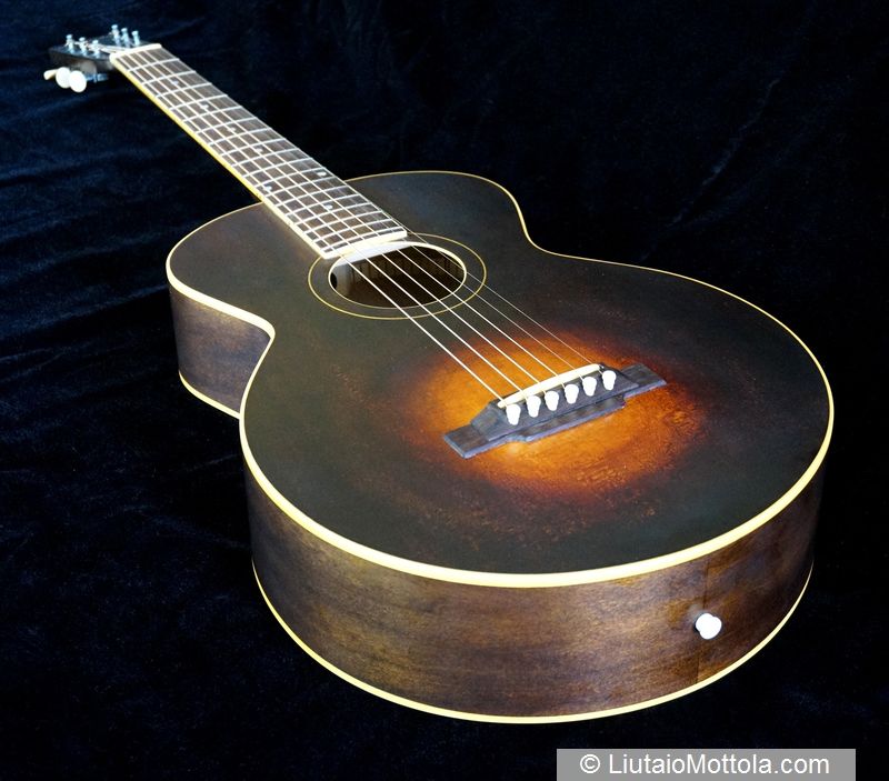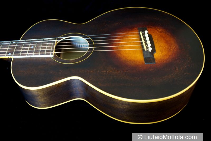 The guitar pictured here is a look alike instrument. I was fascinated by the use of birch in the original L series guitars. This wood was commonly used for inexpensive factory instruments at that time. I built this guitar with back, sides and neck from a similar light-colored wood, tulip poplar. The instrument was finished in brown dye with a hand-applied sunburst top and back. Plastic bindings on body and neck and lining the soundhole are like those used originally.