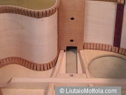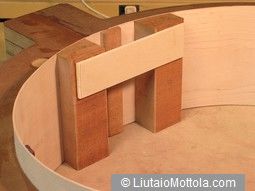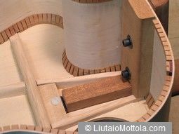 Since the angle at which the strings approach the anchor blocks is acute, string tension tends to force the blocks together, which would tend to bend the ribs at the butt end. After the blocks are glued into the ribs a small piece of Baltic birch ply is glued across the front surfaces of the anchor blocks near the top to counteract this. Here's what the butt end looks like from the inside: