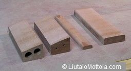Since the wound portion of bass strings are too thick to be wound around the tuning posts, one can never be too cavalier about fitting the strings of any bass. In the Tinozza bass the strings are run into holes at the back of the body, through two string anchor blocks, and then exit the body through the top. The string anchor blocks are shaped and drilled before they are glued to the ribs. Here are all the blocks for the instrument: