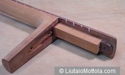 The neck extension core is present only as a support for the trussrod. On this instrument the trussrod adjusting nut is at the headstock end. Unfortunately off the shelf trussrods are not available in lengths entirely suitable for ABGs and a long electric bass trussrod was used in this neck. The neck extension supports the extra length of the trussrod.