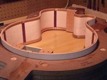 To increase the mass a bit and lower the resonant frequencies of the instrument, both plates are on the thick side – about 0.125" each, but thinned a bit around the edges. Both are domed, the top to a 30' radius and the back to a 15' radius. Back bracing is standard ladder style: