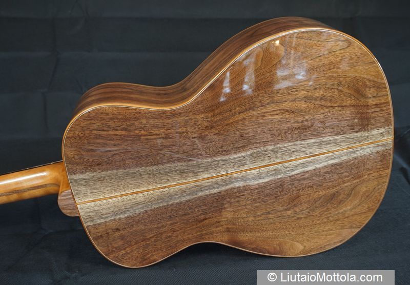 The insides of this instrument are also made entirely of domestic species. Linings are made of tulip poplar, blocks are of cherry, and the bridge plate and soundhole reinforcement ring are made of black walnut. Does the use of domestic species compromise the sound of the instrument in any way? Anecdotal evidence from folks that have played this instrument as well as others made from domestic species pretty clearly indicates that instruments constructed from domestic species sound every bit as good as those made from tropical species. These anecdotes are backed up be research performed by the Leonardo Guitar Research Project. This group performed considerable blind testing of guitars made of both domestic and tropical species. Although their testing was limited to classical guitars the results are likely applicable to steel strung instruments as well. And then there is a rigorous scientific study performed by a peerless group of researchers led by Samuel Carcagno which did test steel string acoustic guitars and came up with similar results. You may also be interested in the discussion about the use of domestic species for fine guitars found elsewhere on this website here.
