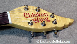 The Chicken Wing is a basic solid body electric guitar in the Fender style, but with a decidedly poultry-tudenous design. It features a bolt-on neck with an angled headstock, two pickups and a surface mounted bridge. This solid body electric works well and is straight forward to build.