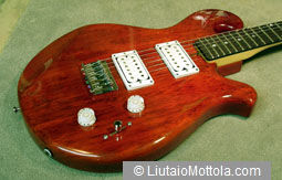 The solid body of the instrument pictured at left is made of Butternut